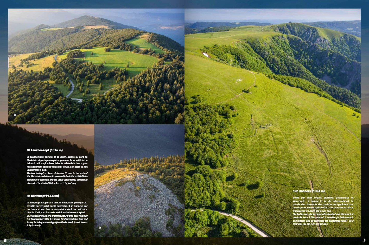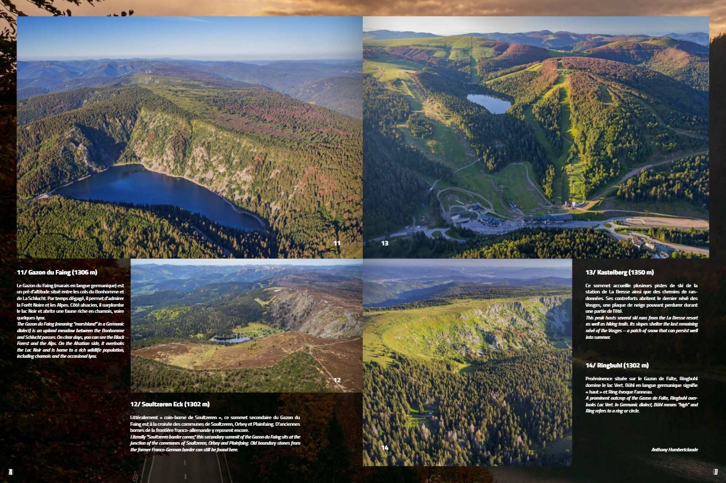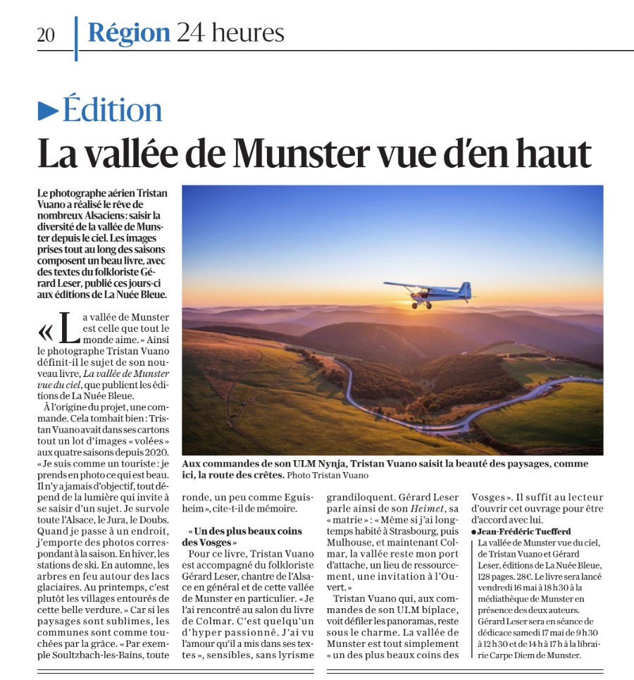 Ses images extraordinaires sont accompagnées par la voix puissante et espiègle de Gérard Leser qui nous livre une véritable déclaration d’amour à cette vallée dont il connait l’histoire et tous les trésors et les secrets. Dans ce livre, leurs regards croisés nous rendent attentifs aux petits détails qui font la singularité de la vallée de Munster et nous invitent à prendre de la hauteur et à écouter le silence lorsque le matin, la brume s’élève, mystérieuse.